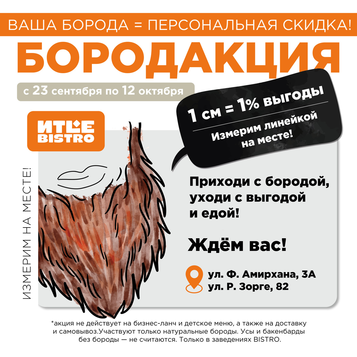 Борода всегда имела особое значение. В Древней Греции и Риме она символизировала статус, у викингов — силу и отвагу. В средневековой Европе длинная борода говорила о благочестии и учености, а короткая — о военной доблести. Со временем борода стала визитной карточкой философов, ученых и мыслителей, подчеркивая их интеллектуальный и социальный статус. Борода выполняет не только эстетическую функцию, но и приносит реальные преимущества: Вдохновлённые исторической значимостью бороды, ИTLE BISTRO запускает уникальную акцию, где каждый сантиметр бороды превращается в скидку на любимые блюда и напитки. В ИTLE BISTRO, современном халяльном заведении Казани, стартовала необычная акция. Каждый сантиметр бороды мужчины приносит скидку на ужин: 1 см бороды = 1% скидки Измерение проводят сотрудники бистро — честно и справедливо: от линии подбородка до конца волос. Учитывается только естественная растительность, без накладных или искусственных добавок. Скромная борода сократит итоговый счёт, а вели