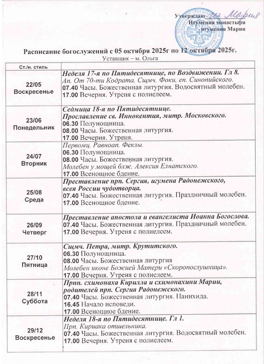05-12.10. Расписание богослужений в Введенском женском монастыре г. Иваново