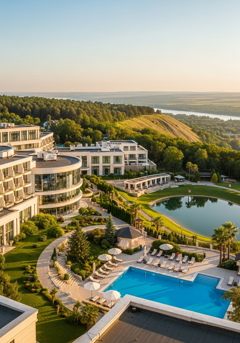 Современный пятизвездочный комплекс расположен в окружении хвойного леса в экологически чистом районе Волгограда. Территория отеля раскинулась на живописной возвышенности, где гости могут насладиться чистейшим воздухом и величественными соснами. До центра города всего 13 километров, что позволяет легко добираться до основных достопримечательностей.