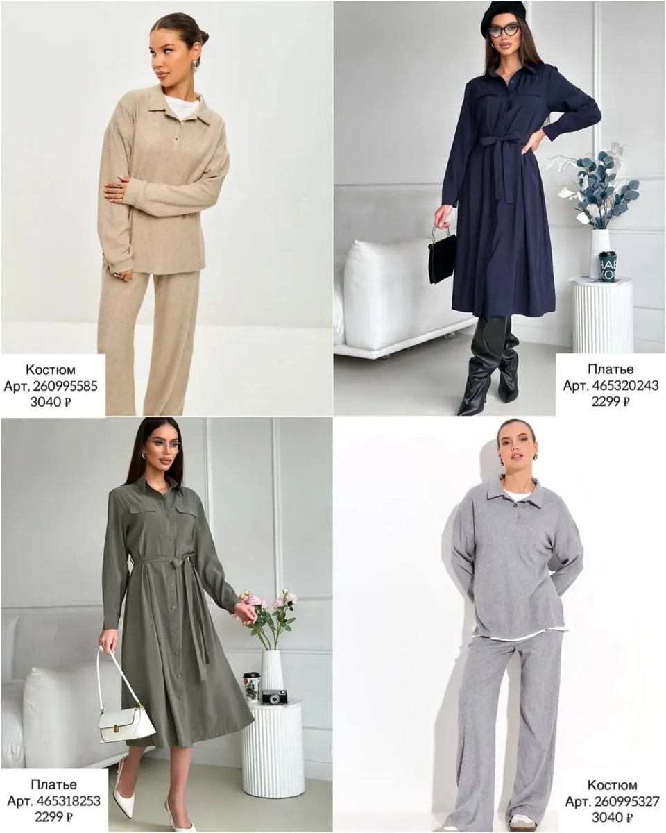 В этой подборке — выдержанные повседневные образы на каждый день: от расслабленных костюмов до женственных платьев, от уютного трикотажа до минималистичных кардиганов. Я иду строго по порядку с артикулами, как на фото, а к каждой вещи добавляю практичный совет стилиста.