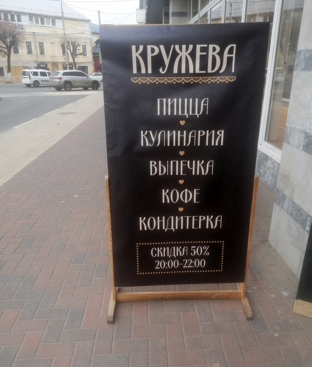 В нашей Рязани, в многострадальном «Гастрономе» на площади Ленина, том, что на первом этаже бывшей гостиницы «Москва» (ныне банк «Россия»), открылось новое гастрономическое заведение «Кружева» с вдохновенно московским ценником :)