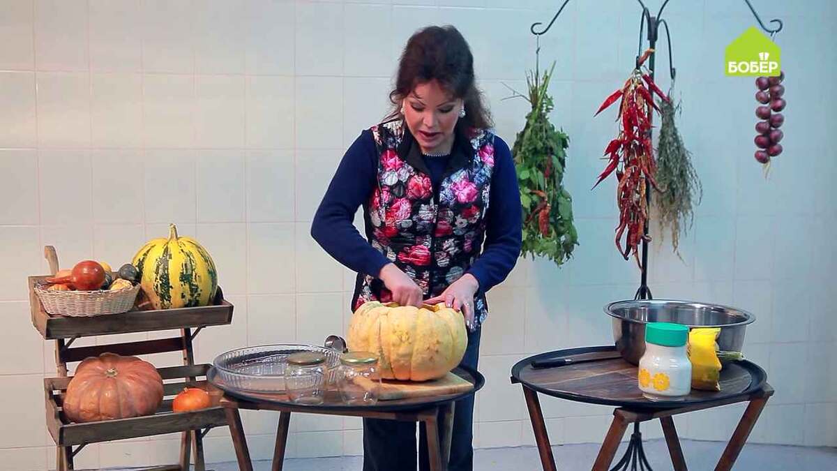 В тыкве содержится каротина в 4 раза больше, чем в моркови, а также очень много витамина С. Зарядите ваш иммунитет пользой! Тыкву храните на чердаке — в помещении, которое хорошо проветривается. Однако плод надо укрыть тёмным материалом. Если у тыквы повреждён черешок, нет смысла её хранить. Плод со временем набирает сладость, поскольку крахмал, который в нём содержится, преобразуется в сахара. Вот почему, чтобы тыква была вкуснее, нужно сорвать её, положить на чердак и забыть до весны. У тыквы срежьте верхушку. Вычистите изнутри тыквы семечки и часть мякоти. Чем больше сахара войдёт, тем больше мёда получится. С верхушки тыквы уберите семечки и лишнюю мякоть. Насыпьте в тыкву столько сахара, сколько поместится в плод. В данном случае ушло 2 килограмма. Закройте тыкву «крышкой», установите в таз и отправьте в тёплое тёмное место на неделю. Спустя время черешок отвалится, а внутри образуется «мёд». Разлейте сироп по стерилизованным банкам. В тыкве содержится много пектина, за счёт котор