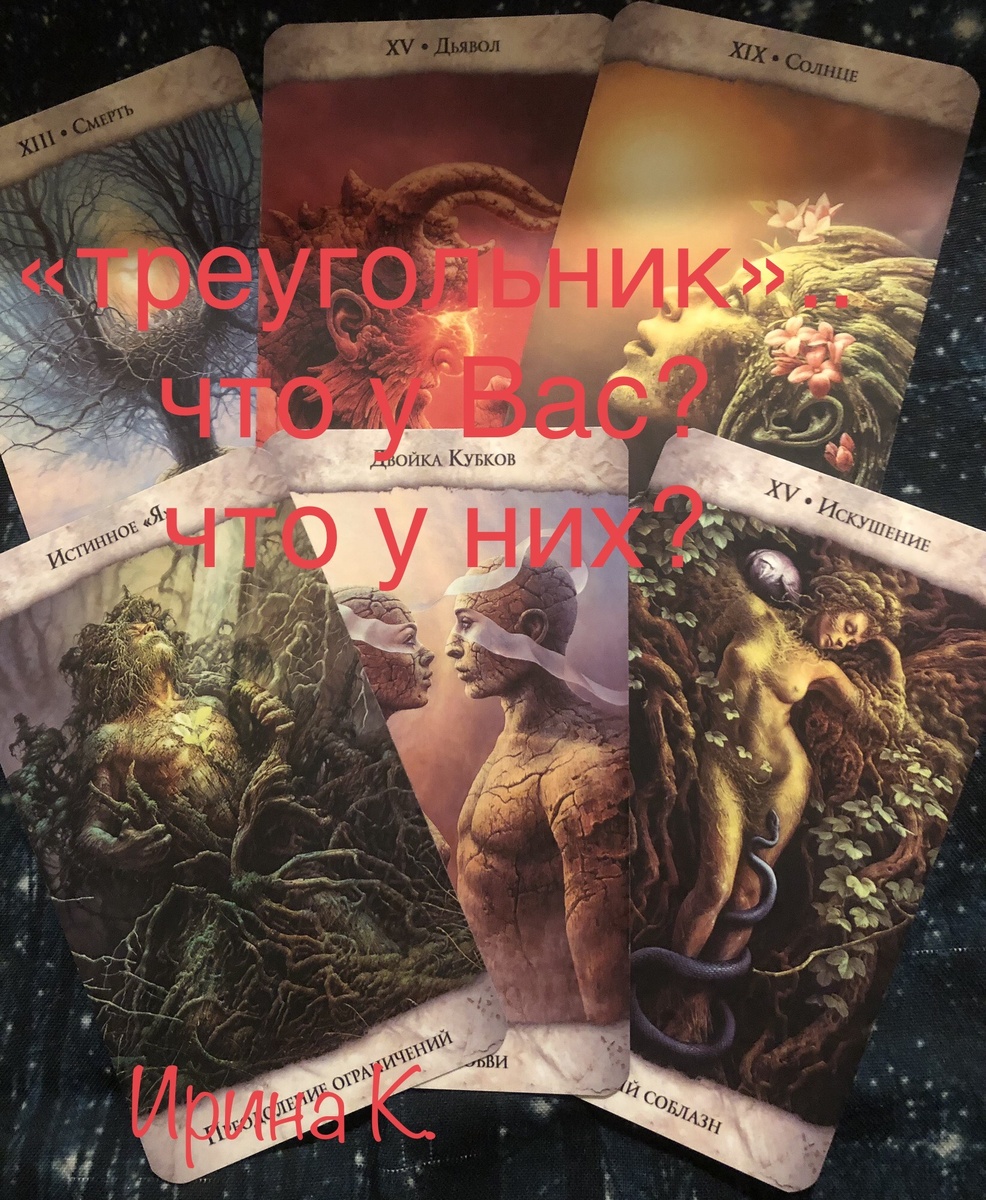 и снова поспрашиваем карты на тему противоборства в «треугольных» отношениях… Это всегда болезненно,радость вперемешку с отчаянием, надежды и тревоги..,и главное-а дождетесь ли вы его? расклад общий..,узнаете себя-ищите подсказки… начнем с мужчины..,какой он сейчас и что волнует его в данный момент? ну хитроватый тип вылез из колоды..,думает только про себя.Его больше волнует собственное благополучие. Если он до сих пор играет на два фронта-будьте уверенны,он бы и дальше хотел бы так же сидеть на двух стульях..Врет и вам и ей..,ему так удобно. да,именно так и происходит..Вот есть у него Вы- «Императрица»,красивая игрушка, он любит окружать себя красивыми вещами))) И еще одна женщина-Она вам соперница,любит его и страдает,потому что он эту любовь топчет и рушит.. Часто ссоры у них происходят. ———-////////////////////////////——————- что же сейчас между вами и каков его настрой в вашу сторону? недавно он очень резко высказал вам в ответ на ваши вопросы…А какие могли быть вопросы? Да в