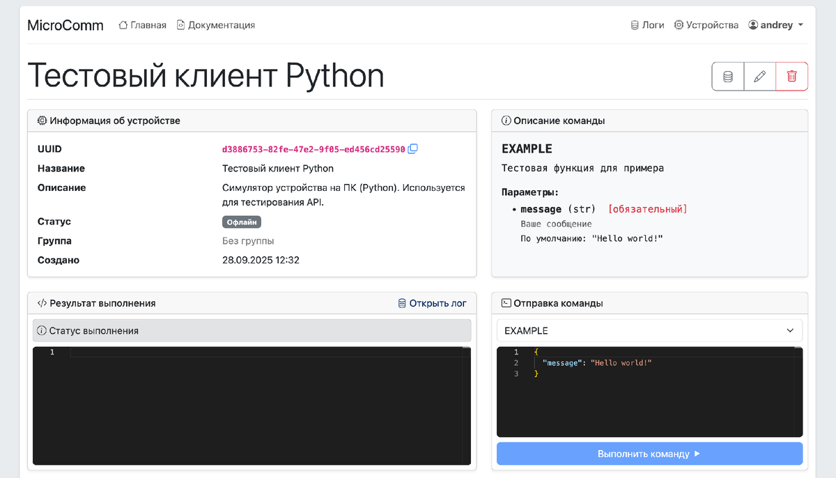 Всем привет! Хочу показать небольшой проект, над которым сейчас работаю — microcomm.ru. Это сервис для тех, кто делает IoT-устройства. С MicroComm вы можете: - отправлять команды на устройство удалённо, - получать ответы с результатами выполнения, - видеть полную историю: что отправляли, когда, какой был ответ и были ли ошибки. Кроме того, устройство может присылать собственные логи — а в будущем вы сможете работать с ними через API (например, для аналитики или отладки). Всё это работает «из коробки»: не нужно настраивать серверы, писать бэкенд или разбираться со сложными протоколами. Просто создаете устройство на сайте, выбираете подходящий клиент и управляете своим устройством через веб или API Очень люблю питон, поэтому написал клиент для ESP32 на MicroPython. Кто знаком с MicroPython, можете попробовать: microcomm.ru/...ted Есть еще набросок клиента на Python: microcomm.ru/...hon
