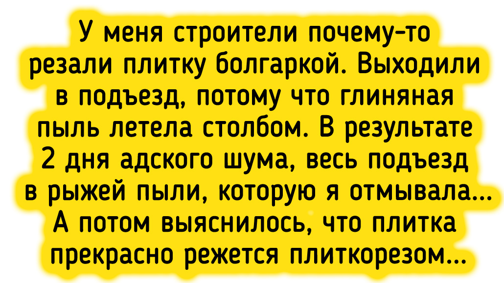 У меня строители почему-то резали плитку болгаркой. Выходили в подъезд, потому что глиняная пыль летела столбом. В результате два дня адского шума, весь подъезд в рыжей пыли, которую я отмывала. А потом выяснилось, что плитка прекрасно режется плиткорезом. © Хильдур / ADME