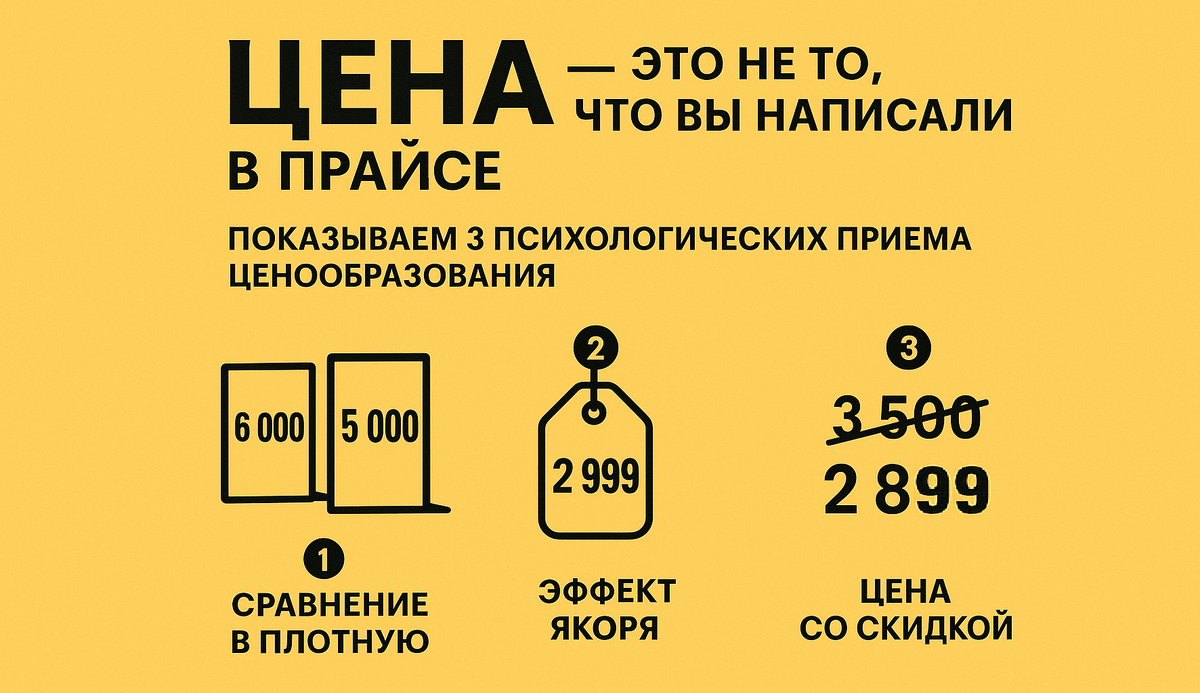 Ваш клиент видит ценник, а его мозг уже принимает решение: «Беру!» или «Дорого». И этот выбор часто не имеет ничего общего с реальной стоимостью. Это игра на бессознательном уровне. И если вы в нее не играете, вы теряете деньги. Готовьтесь узнать правила. Вот 3 приема, которые заставляют клиентов покупать, даже если они сами не понимают почему. Как работает: Мозг ищет точку отсчета — «якорь». Первая увиденная цена становится этой точкой. Все, что вы покажете после, будет оцениваться относительно нее. Живой пример: В первой кофейне эспрессо за 150 ₽ стал якорем, на фоне которого капучино кажется выгодной покупкой. Как применить: Как работает: Это называется «эффект левой цифры». Мозг считывает цену слева направо. Для нашего восприятия 999 ₽ — это 900 с чем-то, а не 1000. Разница в 1 рубль создает иллюзию разницы в целую сотню. Живой пример: