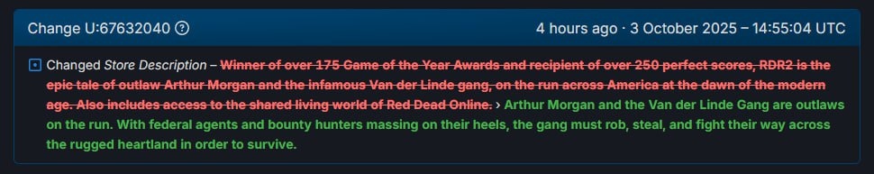Rockstar поменяла описание Red Dead Redemption 2 в Steam. Новое описание: Артур Морган и другие подручные Датча ван дер Линде вынуждены пуститься в бега. Их преследуют федеральные агенты и охотники за головами. Чтобы выжить, банде придется участвовать в кражах, грабежах и перестрелках в самом сердце Америки. Прежнее описание, которое было на странице игры с релиза на ПК в 2019 году. Игра RDR2, получившая более 175 наград и 250 высших оценок от игровых изданий, – это грандиозная история о судьбе бандита Артура Моргана и банды Ван дер Линде, которые скрываются от закона по всей Америке на заре новой эпохи. Включает также доступ к общему живому миру Red Dead Online. Ранее ходили утечки, что до конца года вестерн выпустят на Switch 2, PS5 и Xbox Series.