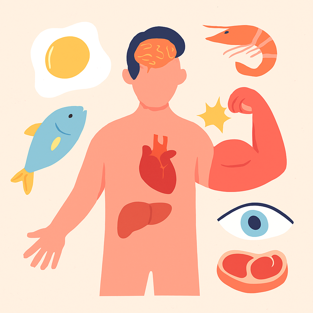 Это молекула, которая заботится о сердце, мозге, зрении и выносливости. Разбираем по-простому, зачем он нужен и где его взять. --- Таурин — это аминокислота, которая не строит мышцы, но помогает им работать. Он есть в нашем теле с рождения и участвует почти во всех важных процессах: ✅регулирует давление и сердцебиение ✅защищает мозг от перегрузки ✅улучшает сон и настроение ✅сохраняет зрение ✅ помогает печени и пищеварению ✅ снижает воспаление и поддерживает иммунитет --- Таурин — это: 📍меньше судорог и усталости 📍лучше восстановление после тренировок 📍стабильный пульс и давление 📍ясная голова и концентрация Он не «взбадривает», как кофеин, а поддерживает тело изнутри. --- Таурин есть в продуктах животного происхождения: 🥩мясо (особенно говядина, курица) 🐟рыба и морепродукты 🍳 яйца 🥛 молочные продукты В растительной пище его почти нет — вегетарианцам стоит подумать о добавках. --- Визуально и по ощущениям: 🏃♀️усталость, особенно п