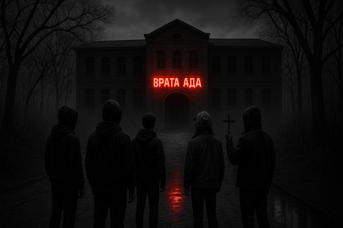 Настроение поднялось, когда мы свернули на разбитую гравийную дорогу. Под красным сиянием приветственной вывески «Врата Ада» мы проехали дальше. Буквы горели, как напалм, на фоне затянутого облаками беззвёздного неба. В кровь ударил адреналин, когда мы петляли среди искривлённых деревьев, скрывавших бывшую начальную школу.