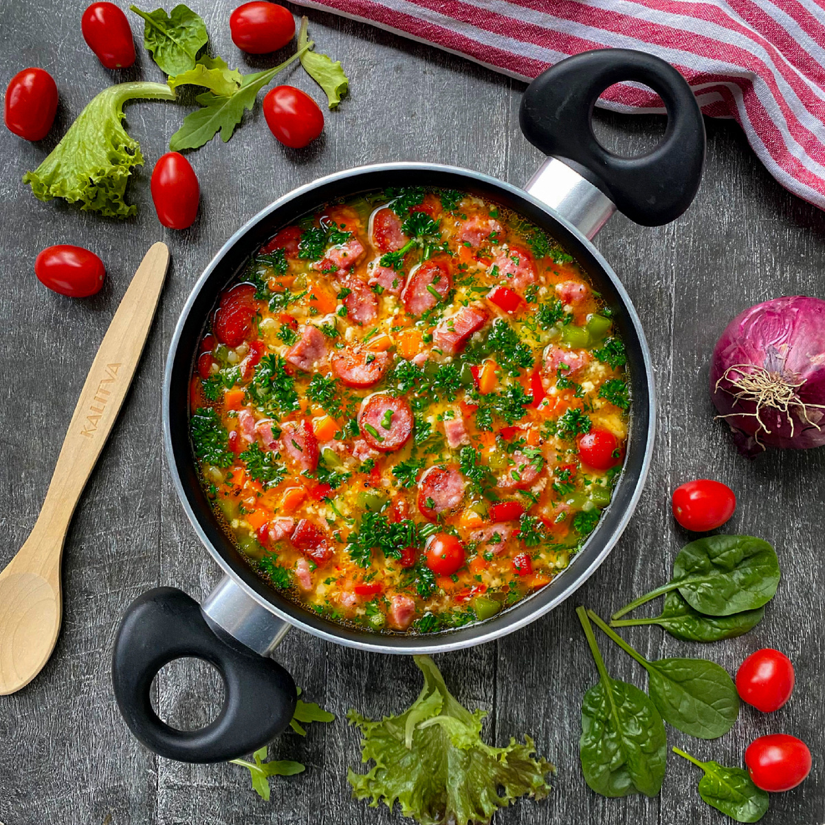 Простое и сытное блюдо для всей семьи! Овощи, копчёные колбаски и лёгкая лапша — суп получается ароматный, яркий и очень домашний. ✅ картофель — 2 шт. ✅ морковь — 1 шт. ✅ кабачок — 1 шт. ✅ болгарский перец — 1 шт. ✅ репчатый лук — 1 шт. ✅ копчёные колбаски — 4 шт. ✅ лапша яичная — 1 горсть (по вкусу) ✅ зелень свежая — для подачи ✅ соль, перец — по вкусу ✅ растительное масло — для жарки ✅ вода — 1,5–2 л ▪️ В кастрюлю линейки KUMIR наливаем воду и ставим закипать. ▪️ Картофель нарезаем кубиками и отправляем в кипяток. ▪️ Морковь и лук мелко рубим, обжариваем на сковороде с маслом до золотистого цвета. Добавляем болгарский перец и кабачок, тушим пару минут. ▪️ Перекладываем овощи в кастрюлю к картошке. Солим и перчим по вкусу. ▪️ Нарезаем колбаски кружочками и кладём в суп. Доводим до кипения. ▪️ Добавляем лапшу и варим ещё 5–7 минут до готовности. ▪️ Перед подачей посыпаем свежей зеленью. Вот и всё — быстрый, ароматный и очень аппетитный супчик готов! 🥄 Такой вариант отлично подойдёт дл