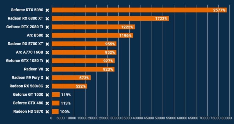 К 25-летию издание PC Games Hardware провело масштабное тестирование 180 видеокарт с 2009 по 2025 год. Результаты показывают, что производительность топовых моделей за этот период выросла на 2477%, если сравнивать флагман 2025 года NVIDIA GeForce RTX 5090 с пионером DirectX 11 — ATI Radeon HD 5870. Исследование демонстрирует, что закон Мура всё ещё работает в сегменте GPU, но сместился в сторону специализированных блоков (тензорные, RT-ядра). За 16 лет видеокарты превратились из чисто графических ускорителей в универсальные вычислительные платформы. Полные результаты доступны в исходном материале. На графиках видно, что самый значительный скачок произошёл после 2018 года с приходом трассировки лучей и ИИ-технологий. Подписывайтесь на наш телеграмм канал и читайте новости в удобном формате — https://t.me/occlub_ru. Прямо сейчас там идет розыгрыш корпуса.
