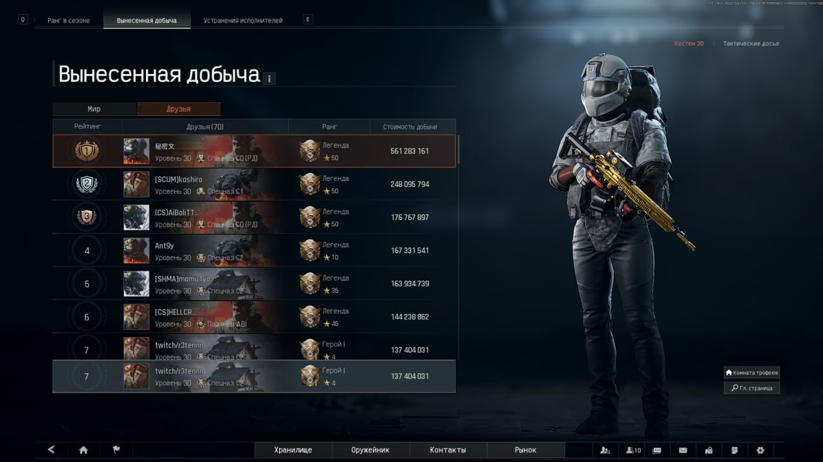Всем ОГРОМНОЕ спасибо за стрим! Одиннадцать с половиной часов сегодня дали газу, Я ПРЯМ ЛЮТО КАЙФАНУЛ, если бы не красный Арсенал конечно с этими квестами, то даже лучше бы всё вышло 😁 Лутанули сегодня прилично, за эту неделю вынос уже составляет 137 млн, а по киллрейсу 142, и в турнирной таблице после сегодняшнего стрима дали лютый шаг вперёд, с 350+ места где я находился запрыгнули аж на 174 место 😳 Увидимся с вами завтра 👋🏻