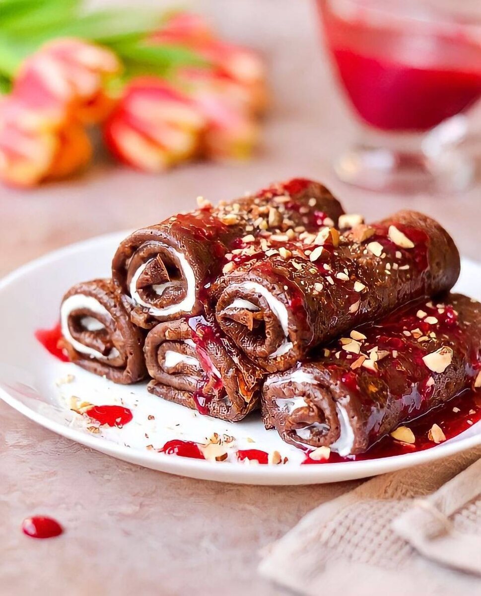 Ингредиенты на 2 порции: Для блинов: ▫️молоко — 250 мл ▫️яйцо куриное — 1 шт. ▫️творог — 75 г ▫️сахар — 1 ст.л. ▫️ванилин — 1 щепотка ▫️мука — 90 г ▫️какао — 1 ст.л. ▫️кипяток — 90 мл ▫️растительное масло — 1 ст.л. Для начинки: ▫️сметана — 150 г ▫️сахарная пудра — по вкусу Для вишневого соуса: ▫️вишня — 100 г ▫️сахар — 2 ст.л. ▫️кукурузный крахмал — 1 ч.л. ▫️вода — 70 мл Способ приготовления: 1. Для приготовления блинов подогрейте молоко до 50°C, добавьте яйцо, сахар и тщательно размешайте. Добавьте творог (если сильно крупный, пробейте блендером), муку, какао и ванилин. 2. Влейте кипяток и растительное масло. Оставьте на 10 минут. 3. Выпекайте блины на сильном огне с двух сторон до румяности. Получится около 10 блинов. 4. Для приготовления вишневого соуса кладите в кастрюлю вишню, сахар и воду. Доведите до кипения и готовьте пару минут. Крахмал смешайте с 1 ст.л. воды и добавьте к вишне при постоянном помешивании, варите до загустения. Затем пробейте блендером до однородности. 5. Слож
