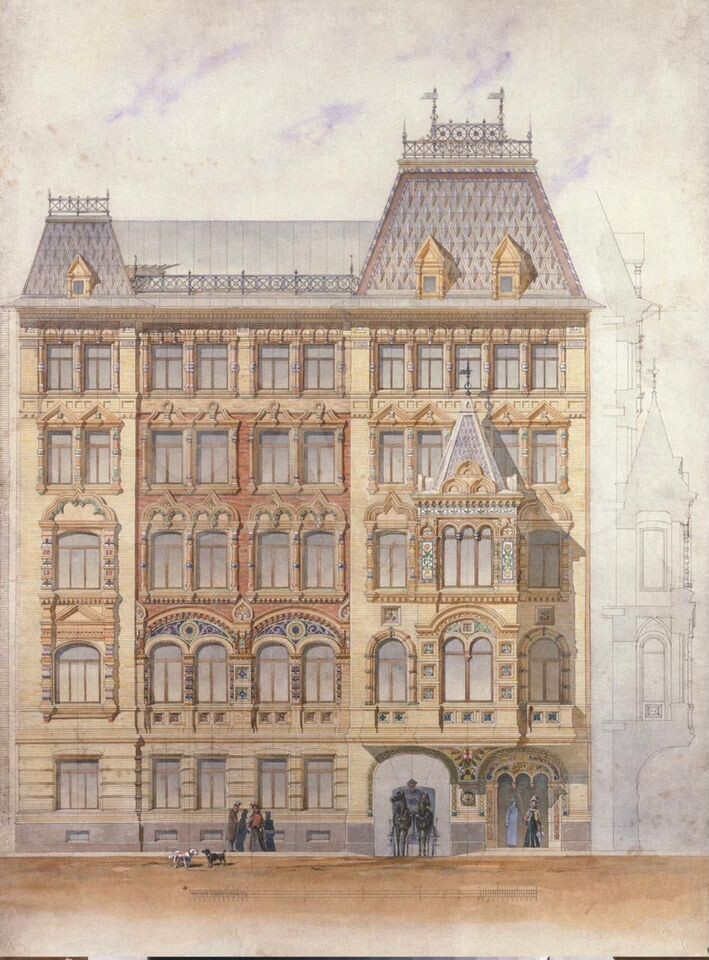 Собственный дом архитектора Никонова — Колокольная улица, дом 11. Бесподобное здание в неорусском стиле, декор фасада поражает разнообразием — штукатурная отделка, открытая кирпичная кладка и красивейшие изразцы с керамикой. Возведено в 1899–1900 годах собственно самим Николаем Никитичем, здесь же он и проживал последующие пять лет. К всеобщему удовольствию, в наши дни здание отлично сохранилось, и вроде бы недавно его реставрировали. В парадной этого дома сохранились витражи, хотя сама лестница не в лучшей форме. К чему мне вспомнилось это место? Когда-то в этом блоге была статья о продаже здесь комнаты в коммунальной квартире. Спустя время собственники, видимо, пришли к определенному согласию, и теперь квартира продается целиком, так что есть возможность оценить всю картину. Четвертый этаж, 297 метров общей площади, девять комнат, три печи, два входа, один туалет и ванная, потолки 3,3 метра в высоту. В объявлении смело предполагаю, что это квартира самого архитектора. Комнаты здесь в
