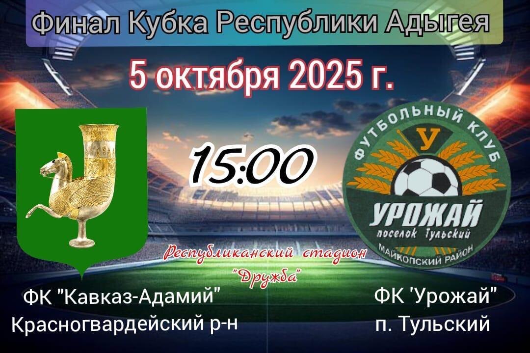 ⚽5 октября в 15:00 на республиканском стадионе «Дружба» в рамках финала Кубка Республики Адыгея пройдет матч между ФК «Урожай» из поселка Тульского и ФК «Кавказ-Адамий» из Красногвардейского района. Поддержать районную команду могут все желающие.