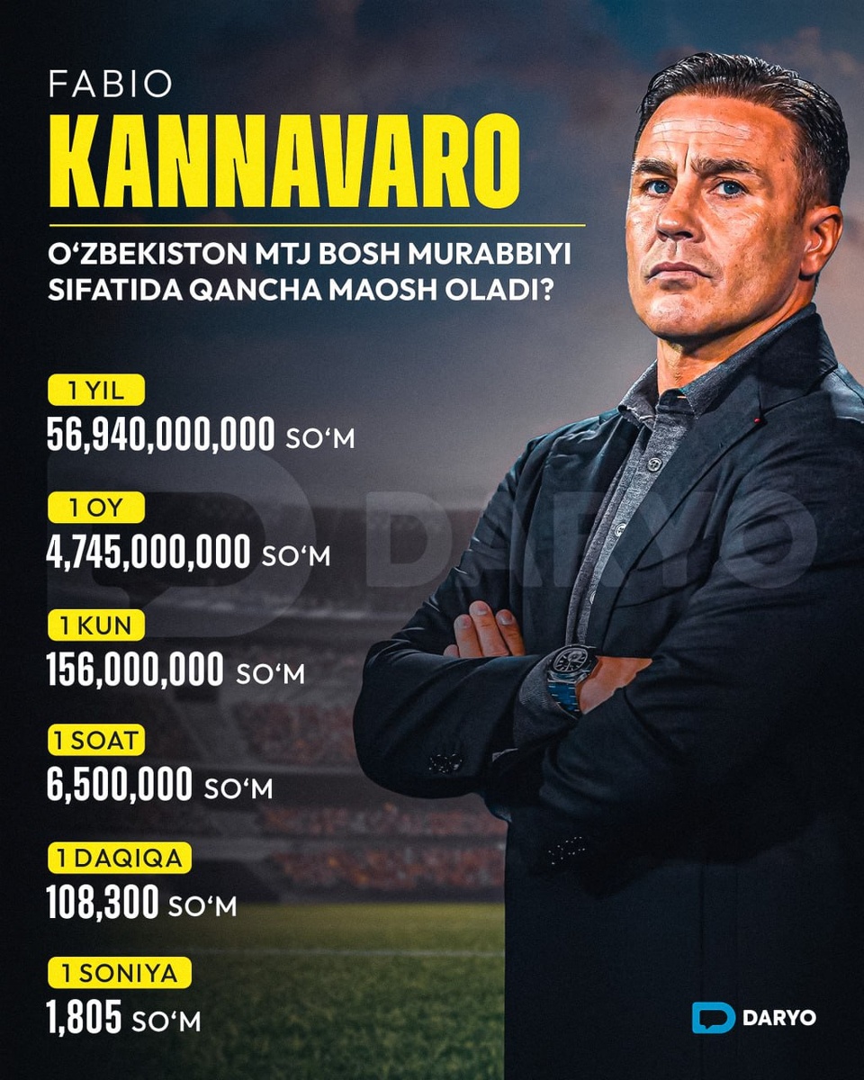 Fabio Kannavaro O‘zbekiston MTJda qancha pul ishlab topadi? P.S.Miqdor O‘zbekiston banklaridagi yevroning so‘mga nisbatan o‘rtacha kursi bo‘yicha hisoblangan @daryolive
