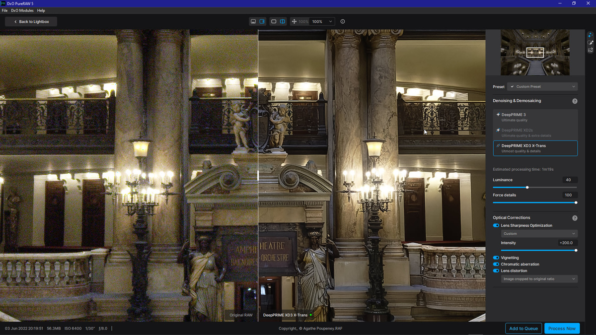 - DeepPRIME XD3 X-Trans: это технология шумоподавления и демозаики DxO нового поколения, которая пока доступна исключительно пользователям сенсоров Fujifilm X-Trans. Шумоподавление и выделение деталей достигли невиданного ранее уровня качества.