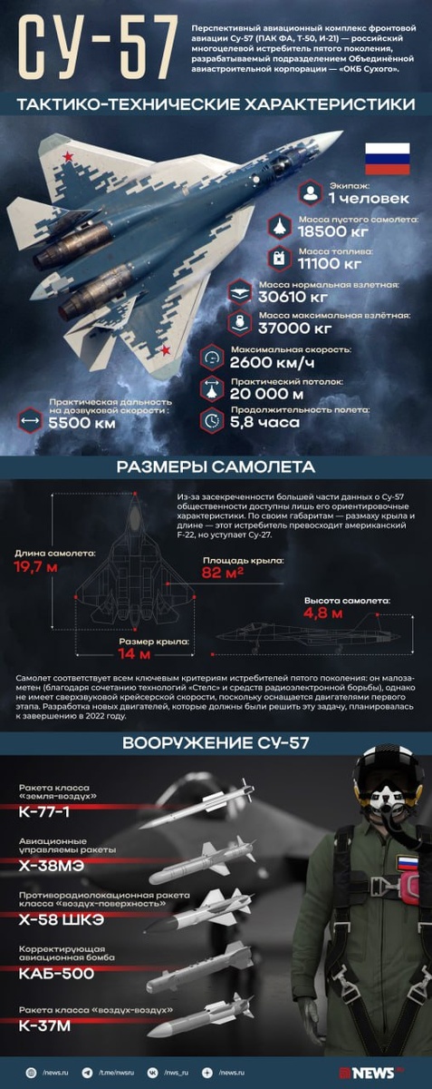 Су-57 — разработка опытно-конструкторского бюро П. О. Сухого. Истребитель поставляют не только на вооружение ВС РФ, но и для экспорта в другие страны. Все о российской боевой машине — в нашей инфографике.