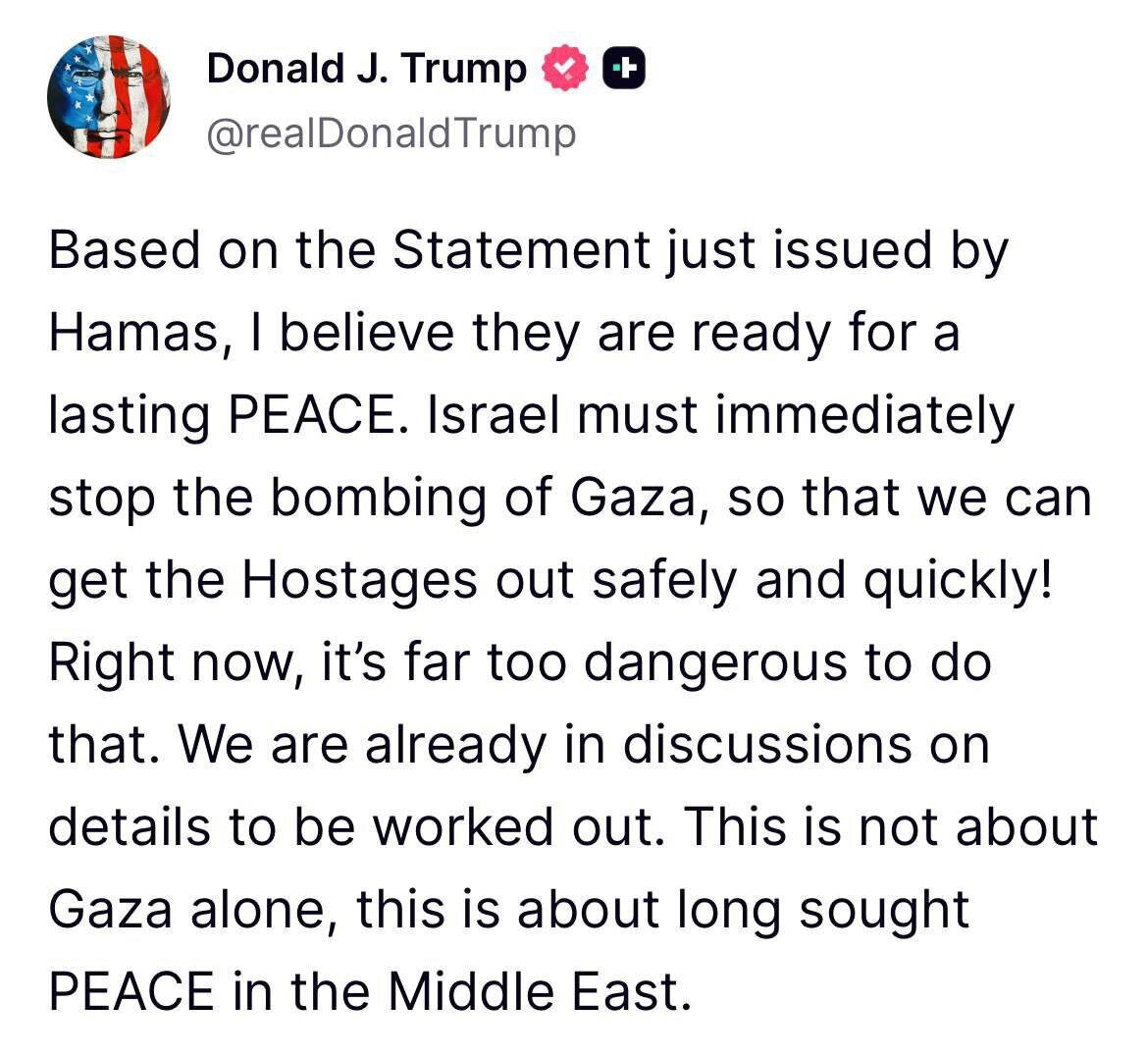 «Израиль должен немедленно прекратить бомбардировки Газы, чтобы мы могли безопасно и быстро вывезти заложников! Сейчас это слишком опасно. Мы уже ведём переговоры по деталям, которые нужно проработать. Речь идёт не только о Газе, а о давно желанном мире на Ближнем Востоке».