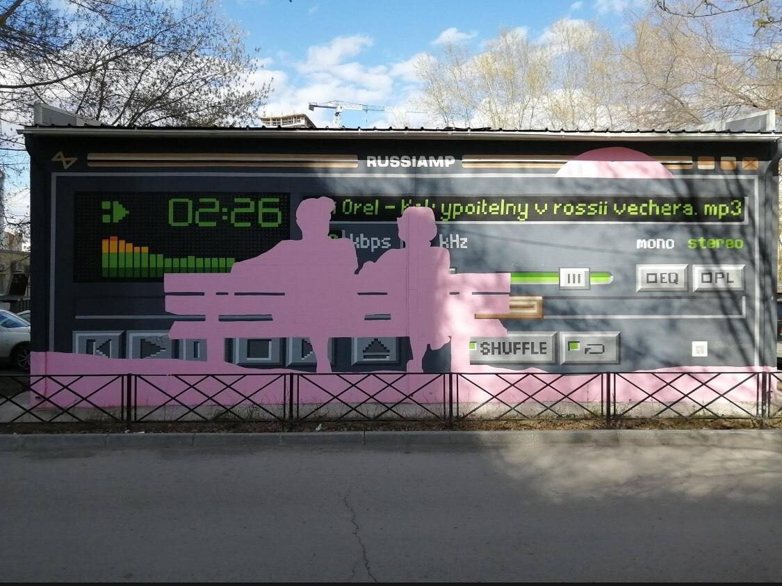 Как упоительны в России вечера… Ностальгическая работа одного из самых известных уральских художников — Ильи Мóзги. Мурал спрятался во дворе… ❤️— за «Гудвином» 🔥— напротив сквера Машарова 👍 — рядом с автовокзалом
