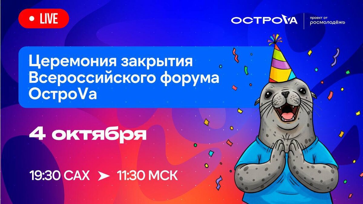 🔥 Сегодня состоится церемония закрытия Всероссийского форума ОстроVа. ✅ Уникальная возможность прикоснуться к празднику есть у всех! Церемонию покажут в прямом эфире! ✏️ В ходе трансляции будут подведены итоги яркого недельного интенсива. 🏆 Назовут имена победителей конкурса Росмолодёжь.Гранты 🎙 Подарком для всех станет выступление хедлайнера – певицы Нюша. ⏰ Время эфира: 11:30 по Москве 19:30 по Сахалинской области Присоединяйтесь!
