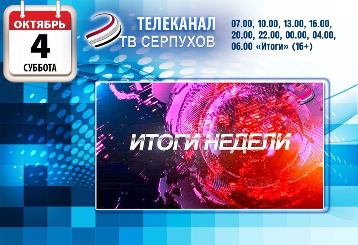 Что смотреть в субботу на нашем телеканале?⤵️ 07.00, 10.00, 13.00, 16.00, 20.00, 22.00, 00.00, 04.00, 06.00 «Итоги» (16+) 06.35, 08.50, 17.15, 19.00 м/ф «Мультфильмы» (6+) 07.30, 17.30, 05.20 д/ф «Люди РФ» (12+) 08.00, 21.25, 22.30 д/ф «Шедевры военных музеев» (12+) 09.10, 10.30, 19.10 т/с «Восемь бусин на тонкой ниточке»(16+) 11.25, 13.30, 23.45, 00.30 т/с «Призрак в кривом зеркале» (12+) 15.10, 16.30, 03.25, 04.30 х/ф «Номер 1» (16+) 18.30 д/ф «Советские прорывы: вдохновение для будущего» (12+) 20.30 программа «НеУроки» (6+) 22.45 д/ф «Имена нелегальной разведки» (12+) Подписаться на ОТВ-Серпухов / ВКонтакте /Одноклассники / МАХ