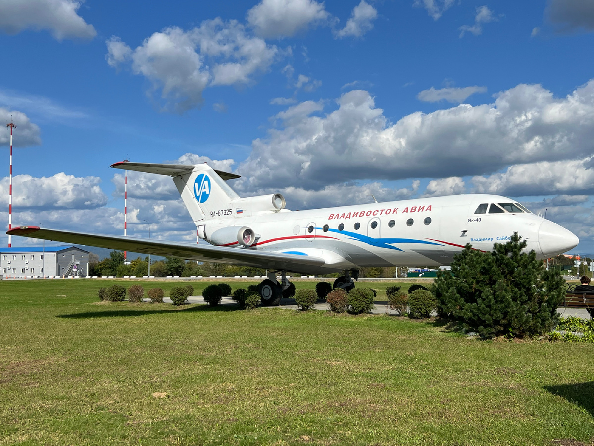 Авиакомпания "Владивосток Авиа" установила свой выведенный из эксплуатации Як-40 на постамент на привокзальной площади аэропорта Владивостока. Авиакомпании такой, правда, уже нет, поэтому можно считать, что это памятник не только самолету, но и авиакомпании. Изначально памятник был установлен на вечную стоянку у терминала "В" 17 августа 2007 году, в канун 75-летия Гражданской авиации Приморья. С 10 сентября 2012 года все рейсы были переведены в новый терминал "А" и пассажиры фактически перестали его видеть. В 2014 году памятник был перенесен к новому терминалу аэропорта на радость пассажирам и сотрудникам аэропорта. Самолет был выпущен 31 августа 1973 года и зарегистрирован 1 октября 1973 года как СССР-87325. В 1993 году был перерегистрирован как RA-87325 и передан 30 марта 1993 года в авиакомпанию Владивосток Авиа. Многие годы Як-40 выполнял полеты по местным воздушным линиям на аэродромы с грунтовым и искусственным покрытием: Лучегорск, Арсеньев, Сергеевка, Спасск Дальний, Плас