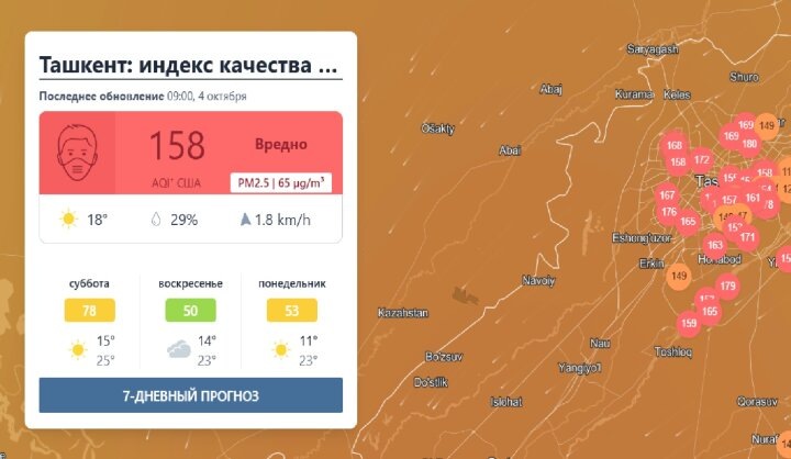 По информации международного ресурса IQAir, в утренние часы 4 октября 2025 года Ташкент занял третье место среди городов мира по уровню загрязнения воздуха. Индекс качества воздуха (AQI) составил 158, что в международной классификации относится к категории "вредный для здоровья". Такой показатель означает, что воздействию загрязнённого воздуха подвергаются все жители города, а наибольшему риску подвержены дети, пожилые люди и лица с хроническими заболеваниями органов дыхания и сердечно-сосудистой системы.