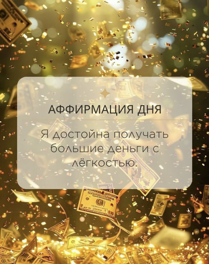 Деньги — это не просто бумага или цифры на счету, а отражение нашего внутреннего состояния, установок и убеждений, и даже родительские фразы, которые мы в детстве слышим от папы, мамы, дедушек и бабушек, ставшие блоками .Многие люди сталкиваются с финансовыми трудностями не потому, что не умеют зарабатывать, а потому что их мышление настроено на нехватку, а не на изобилие. Именно здесь вам придут на помощь аффирмации на деньги, успех и богатство — мощный инструмент, помогающий перепрограммировать сознание и привлечь финансовое процветание. Они работают по принципу самовнушения и помогают заменить ограничивающие убеждения на позитивные. Универсальность аффирмации позволяет заменять слова на те в которых вы нуждаетесь Используйте аффирмации в течение дня и наслаждайтесь приятным и гармоничным потоков вашей жизни с любовью и благодарностью, Марина