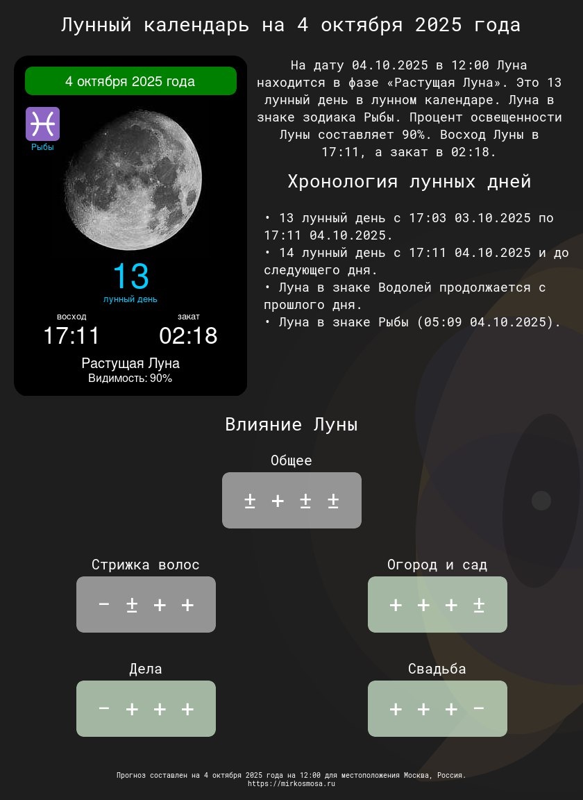 Лунные календари на 4 октября 2025 года: Подготовьтесь к этому дню с учетом влияния Луны! 🔹🌗 Лунный календарь на 4 октября 2025 года — Что приготовила Луна? Подробнее 🔹✂️ Лунный календарь стрижек на 4 октября 2025 года — Подходящий ли день для обновления прически? Подробнее 🔹🌱 Лунный календарь огородника и садовода на 4 октября 2025 года — Лучшее время для ухода за растениями. Подробнее 🔹📅 Лунный календарь дел на 4 октября 2025 года — Удачные моменты для важных задач. Подробнее 🔹💍 Лунный календарь свадеб на 4 октября 2025 года — Подходит ли этот день для вашего торжества? Подробнее