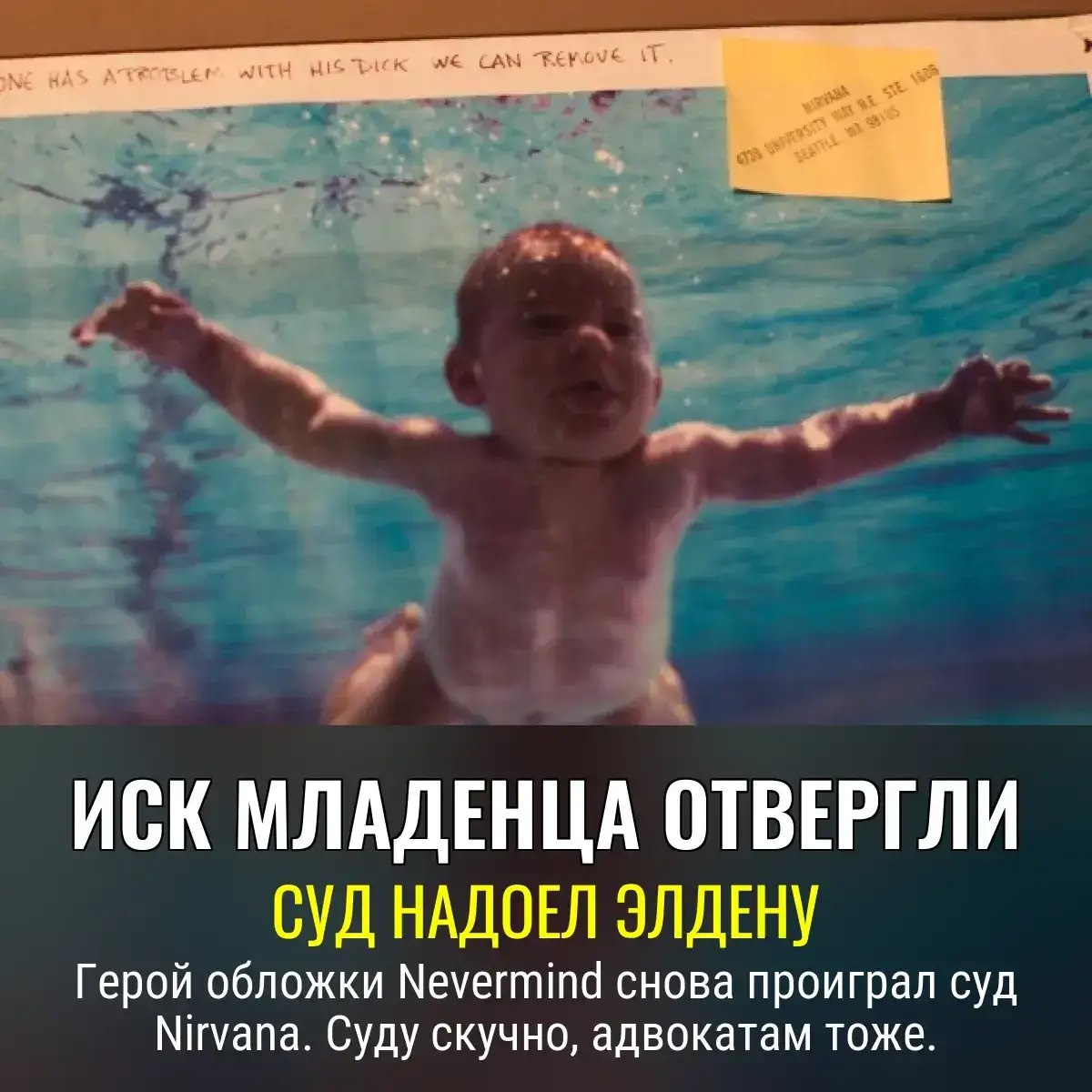 California Dream Fail 🎸 И снова Спенсер Элден – тот самый малыш с обложки «Nevermind», который уже вошёл в мемы, пытается стрясти денег с Nirvana за «секс-эксплуатацию». Но судья Олгуин мигом душит «инфлюенсера»: никакой эротики — просто фотка младенца и доллар. Ну ты ж сам за это бабки не раз получал, Спенсер! 📸 Рокеры Nirvana в восторге, адвокаты их ликуют, а Элден, видимо, печалится без очередного судебного эпизода. Нам остаётся гадать, сколько ещё раз этот парень рискнёт заработать на чужой славе., Следите за новостями 📩
