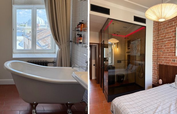 Или как дизайнер совместила классику и современные решения В проекте дизайнер Сабина Неровня работала с пространством квартиры в дореволюционном доме. Важно было оставить аутентичные детали, но при этом создать функциональный и комфортный интерьер для молодого заказчика. Особое внимание уделили санузлам: здесь получилось объединить сразу два разных подхода — современный минимализм в спальне и винтажную классику в отдельной ванной комнате. Первая зона — душевая, встроенная прямо в спальню. На месте старого узкого санузла сделали компактный куб из стекла с матовым затемнением. Так пространство не выглядит перегруженным: прозрачные стены позволяют сохранить ощущение целостности комнаты. Внутри душевой разместили все необходимое — душевую систему, раковину, унитаз и места для хранения косметики и аксессуаров. Потолок здесь специально опустили, чтобы спрятать вентиляцию и встроенные светильники. Разные сценарии освещения позволяют менять настроение в зависимости от времени суток: яркий верх