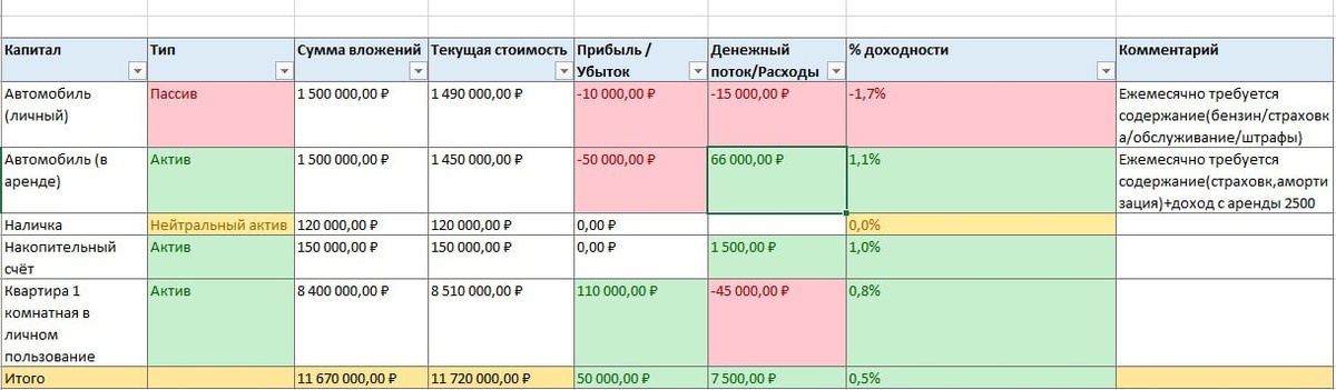 Доброе утро! ☀️ Сегодня хочу честно поделиться примером обычного человека и того, как ваш капитал, работает на вас. Спойлер - не работает. На первый взгляд кажется, что у него всё есть: своя квартира, две машины, свободные деньги на счету. Казалось бы, финансовая стабильность на лицо. Об этом можно только мечтать - многие думают так. Но если разложить по полочкам, становится ясно — далеко не всё приносит доход. Автомобиль для себя — пассив. Каждый месяц он «съедает» 15 000 ₽ на бензин, страховку и обслуживание. Автомобиль в аренде — актив, но далеко не у всех есть такая возможность. Квартира для себя — тоже пассив: траты 45 000 ₽ - это ипотека и ещё расходы на содержание. Кто-то скажет, но недвижимость же дорожает. Проходит очень много лет, плюс не забывайте, какой генерирует расход 1 квартира в месяц, а это на секундочку ипотека - а это не 3-4 года, в среднем 10-15 лет. Накопительный счёт — маленький актив, приносит ~1 500 ₽ в месяц. Наличка — пока «нейтральный актив»: не теряет