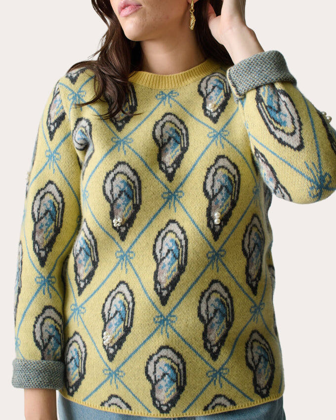 Этот свитер с круглым вырезом, украшен узором с устричными мотивами, задекорирован искусственным жемчугом, пришитым вручную. Жаккард чудесно смотрится в любом изделии. Состав пряжи в свитере: 100% шерсть.
