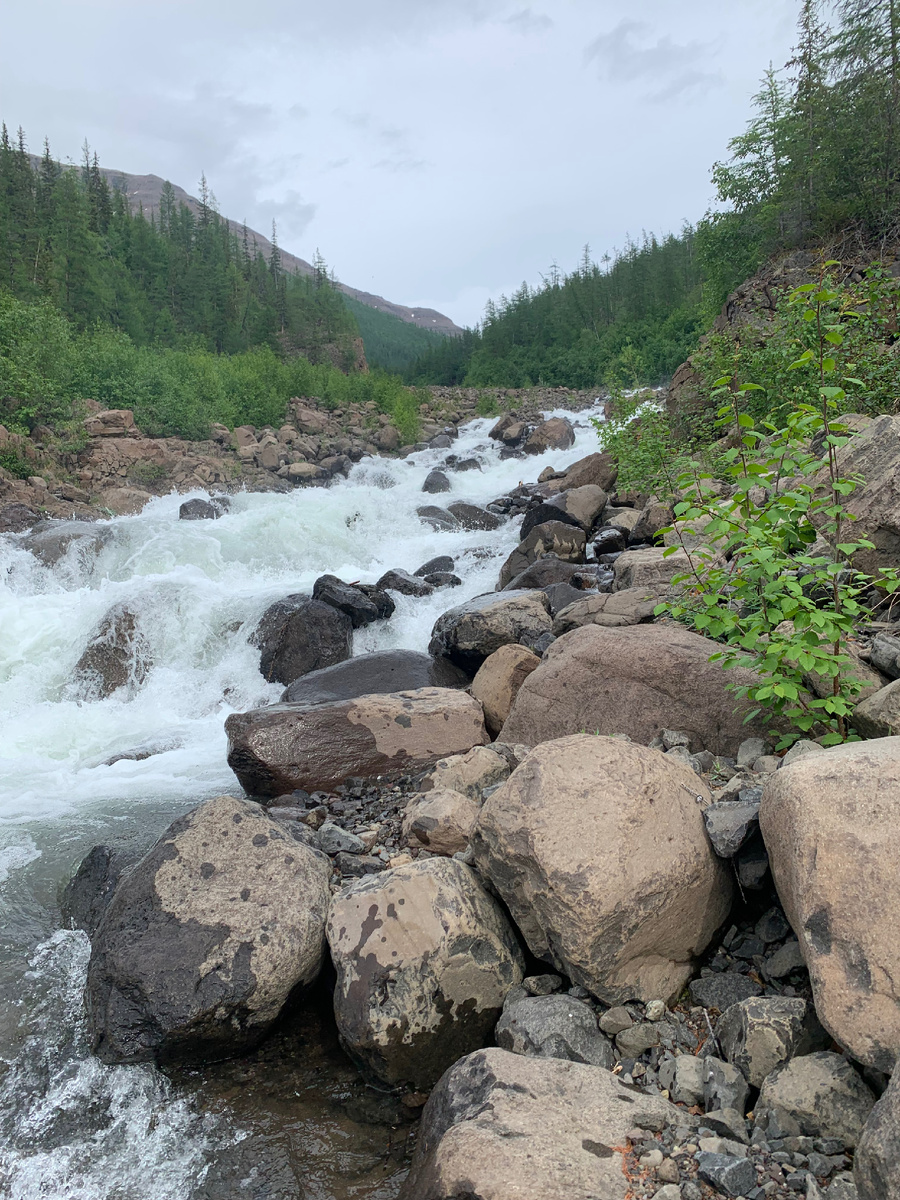 После подъема планировался день отдыха. И только нам, 6 отчаянным, предложили релакс-поход на гору Шайтан, на одном из склонов которой при определенном освещении, проявляется как бы лик шамана. Планировалось, что мы быстро пройдем понизу, далее через пару ручейков на террасу, сделаем привал с шашлыком, потом водопад, а потом также прогулочным шагом до лодки. Все часа на 3-4. Но, гора не зря Шайтан. Она жутковата с самого начала: снизу болотце и мертвые деревья. Ручейки, видимо, ручейками были, в прошлом сезоне. Сейчас это были ревущие потоки. И началось: обходили, пробирались через заросли, заблудились, вернулись, пошли в другую сторону. Потом прошли через поток, держась за инструкторов как за соломинки. Дошли до привала, пока кипятился чай, сходили к водопаду. По возвращению - шашлыки, чай, и так было хорошо, - солнышко, ветерок сносил комаров, что на все предложения инструктора пойти уже домой, мы отмахивались: еще 15 минут. Помог аргумент (где-то через часа 1,5), что сейчас снова п