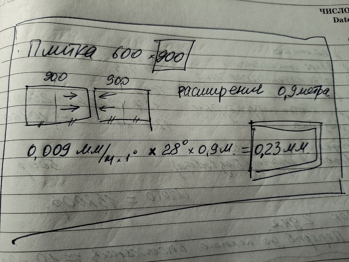 "0,9 м" — габарит плиты. Условно примем, что половина плиты двинет в сторону шва, другая половина двинет расширятся в другую сторону. Таким образом, можно взять в расчет — на каждый шов будут давить с двух сторон две половинки плиты — одна целая! По факту, линейные расширения тел (особенно плоских) штука гораздо хитрее. Но для понимания самого процесса вполне пойдет.