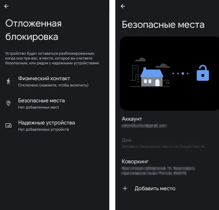 ➡️ Принцип действия: «Отложенная блокировка» позволяет создать индивидуальные сценарии, при которых ваш смартфон будет послушно оставаться разблокированным. Достаточно указать "безопасное место", например, ваш дом, или подключить "надёжное устройство" по Bluetooth, и необходимость каждый раз вводить PIN-код или использовать биометрию отпадет сама собой.
