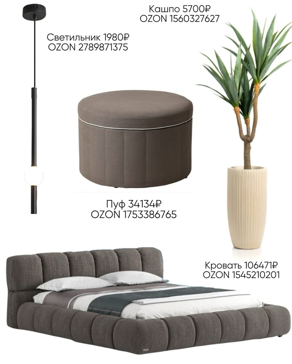 Спальня — это всегда про тактильность, мягкие линии и спокойную палитру. Я собрала три законченных образа с «озон», в каждом — своя история: графитовый оазис с зелёными акцентами, гранатовый ансамбль с ноткой ар-деко и тёплая карамель с архитектурной графикой. Ниже — подробный разбор каждой находки по порядку с артикулами, плюс советы стилиста, чтобы вы легко повторили композиции у себя дома.