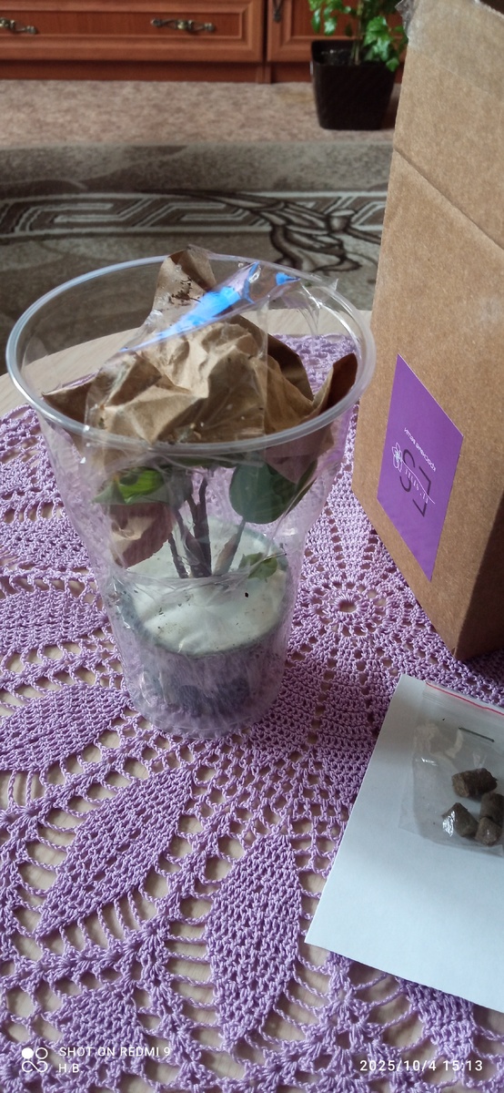 Здравствуйте ,друзья! 🌺 Продолжаю рассказывать о том, что интересного происходит на моих подоконниках. Сначала покажу калатею, которая приехала ко мне сегодня с ВБ. Калатея Виттата задержалась в дороге на один день. Я переживала очень, как она доберется, не замёрзнет ли в дороге? У нас уже по ночам заморозки, а сегодня утром лежал снег. Волновалась зря, калатея доехала хорошо. Была упакована в стакан, сверху пупырка, бумага и коробка картонная. Ну хороша! Хожу вокруг, любуюсь. Конечно, она совсем маленькая, а рядом растет другой росточек. Корни хорошие, уже посмотрела. Покупкой очень довольна. Хотя не раз говорила себе, что калатеи больше покупать не буду. Это уже седьмая в моей коллекции. Ну а теперь расскажу, что нового в горшочке, где проращиваются семена эвкалипта. Пока проросло одно семя. Это я заметила сегодня утром. Такой интересный чудик. Какой-то хвостик в балетной пачке. Тепличку с семенами открывала проветриваться ежедневно. Но в один из дней заметила, что семена набухли