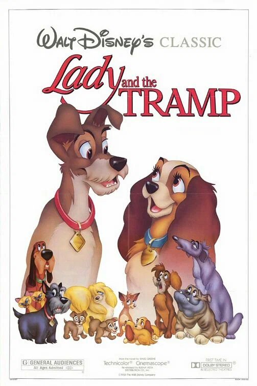 После "Питера Пэна" зрителей 1955 года ожидала более приземлённая история о собачках. Мультфильм снят по повести, но от неё там остался разве что характер собаки, который отдали Бродяге. Сюжет таков: Леди - собачка домашняя, живёт себе с Милым Джорджем и Милой. Пара ждёт ребёнка, и Леди переживает из-за этого. А есть Бродяга - уличный пёс, которого не мог поймать ни один собаколов, но тот попал под очарование Леди. Подборка Челлендж. Disney с начала ТУТ! Покоряют тут с первых минут собачки. Я больше собачница, нежели кошатница, а потому они тут для меня самые лучшие. Леди - милашка с прекрасной "причёской". Она хоть и домашняя, но быстро свыкается с улицей, готова к новому, смело встречается с опасностью, хотя иногда в помощи и нуждается. Но при этом она смелая и утончённая одновременно. Бродяга - очаровательный нахал, умеющий покорить своими россказнями и позитивным отношением к жизни. Он ощущается намного взрослее Леди, но при этом молод "душой". Вообще тут тяжело найти несимпатичну
