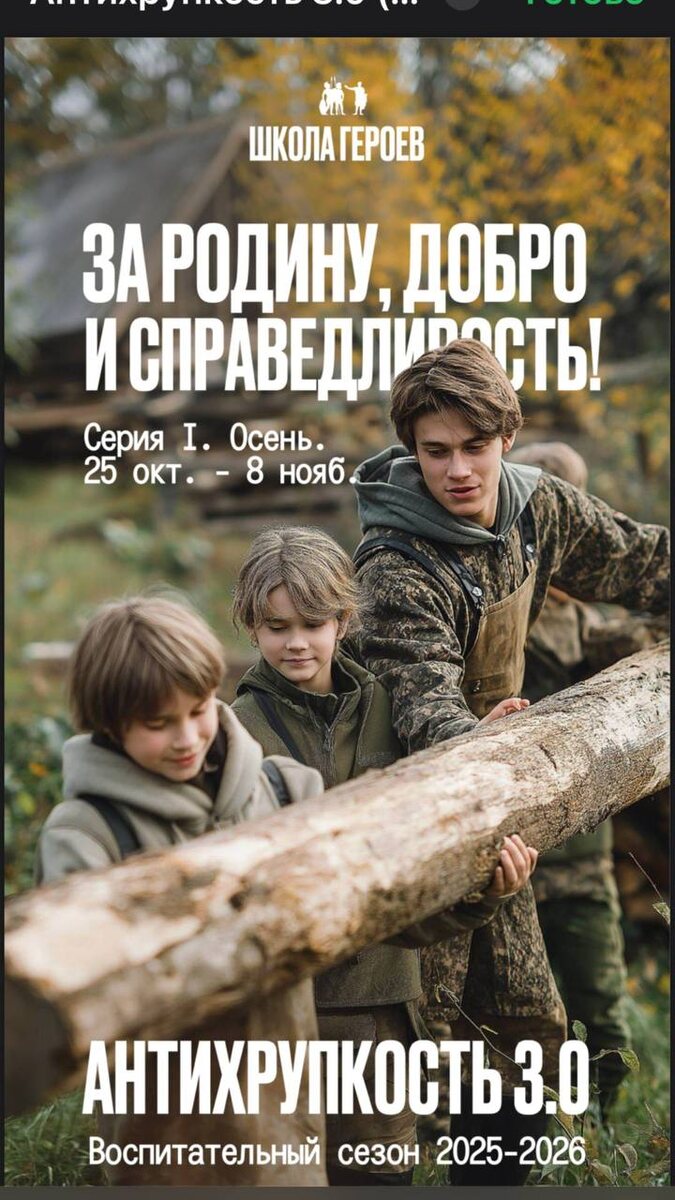 «Антихрупкость 3.0» — осенняя серия для ваших сыновей. Говорю ответственно, ведь мои дети также участвуют в программе воспитания Школы Героев. 📅 С 25 октября по 8 ноября стартует новая серия программы «Антихрупкость 3.0». Каждый родитель мечтает видеть сына сильным, собранным и уверенным. Наша программа помогает мальчишкам пройти этот путь шаг за шагом: учиться дисциплине, ответственности и командной работе. В основе — великие образы нашей истории: ⚔️ Куликовская битва 🤝 Народное ополчение 🛡 Битва за Москву Через них ребята открывают для себя: что значит верность общему делу, как преодолевать трудности, как находить опору в команде и уважении к своим корням. ✨ «Антихрупкость 3.0» — это не разовое событие, а целая система воспитания: осень, зима, весна и лето соединены в единый путь взросления. Каждый сезон несёт свои испытания и открытия, формируя в мальчике характер, стойкость и внутреннюю силу. 👦 Пусть ваш сын почувствует себя настоящим сыном своей земли и пройдёт этот