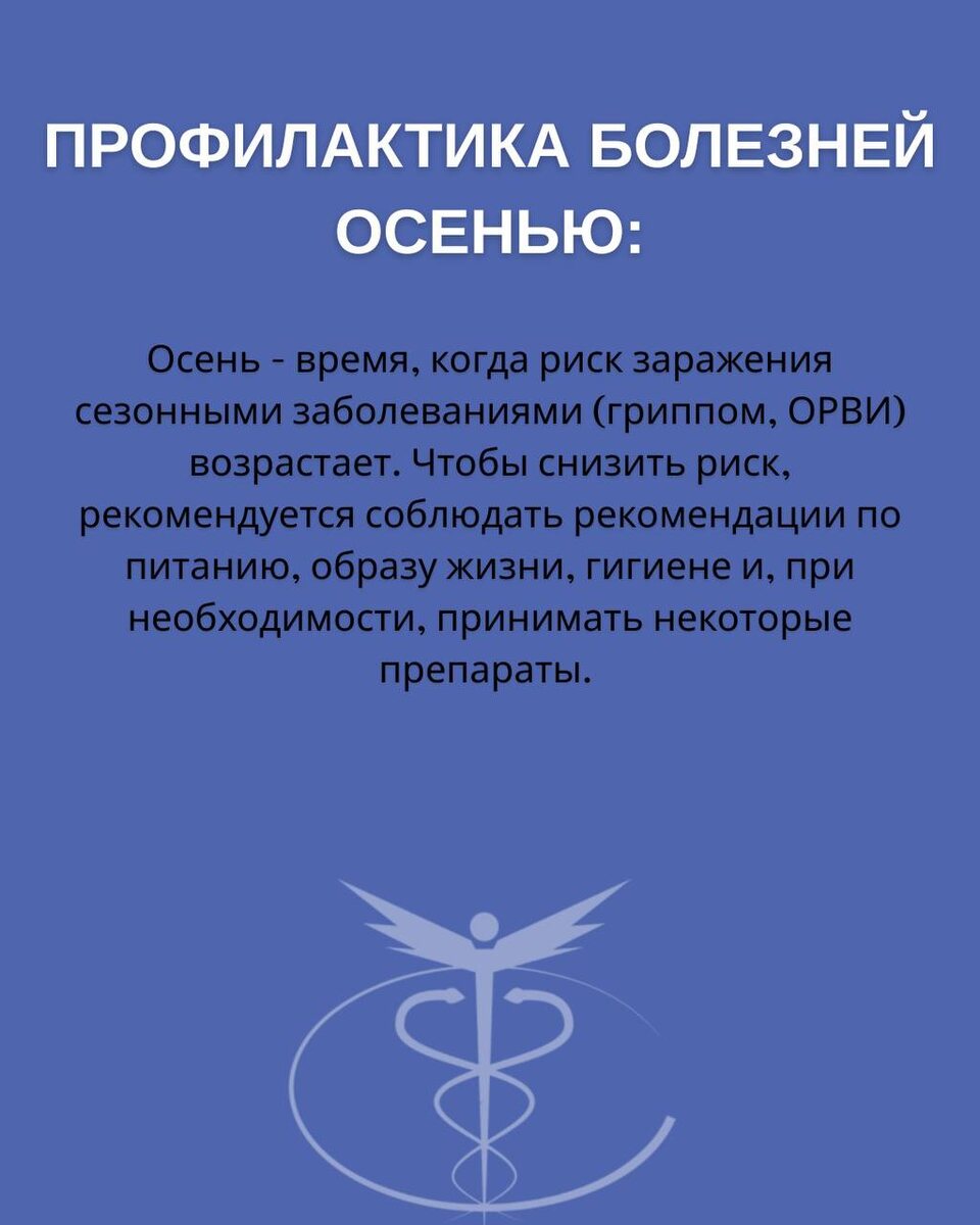 Осень приносит с собой не только уют, но и риск сезонных заболеваний. Мы подготовили для вас подборку простых и полезных советов, которые помогут укрепить иммунитет и защититься от простуды и гриппа. Ознакомьтесь с рекомендациями на карточках - и будьте здоровы вместе с Клиникой Передовой Медицины!