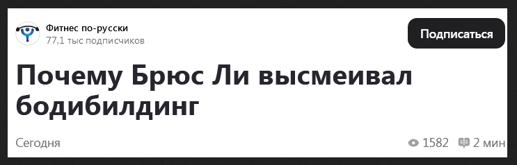 То же самое с Брюсом Ли. Автор использует его имя, даже не имея первоисточника, но публикуя зато его прямые цитаты. Зачем? Да ради тренда против культуризма. А это охваты Дзена. А это возможность рекламы, если аудитория большая. А она у него большая. Всё-таки почти 100000 человек.