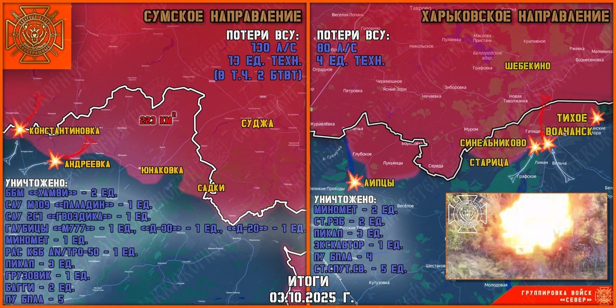 Бойцы РФ раскрыли обман ВСУ и не дали прорвать курскую границу у Константиновки По информации сводки военкоров телеграм-канала «Северный Ветер» на утро 4 октября, боевики ВСУ пытались провести обманный маневр, чтобы прорвать курскую границу в районе Константиновки. По замыслу украинского командования, штурмовики 158 омбр ВСУ должны были отвлечь на себя огневые средства группировки «Север» у Андреевки, в то время как подразделения 225 ошп должны были совершить прорыв госграницы в районе Константиновки. Враг четырежды атаковал позиции российских войск в районе Андреевки. Использовал западную технику. Российские бойцы вели комплексный огонь и отразили атаки. При попытке выдвижения в направлении позиций Северян, уничтожены две штурмовые группы 225 ошп в районе Константиновки, пишут военкоры Отмечено, ВСУ задействовал западную бронетехнику и артиллерию. Существенных изменений на Теткинском и Глушковском участках фронта на наблюдается . Расчеты БПЛА и артиллерия РФ наносили удары по скопл