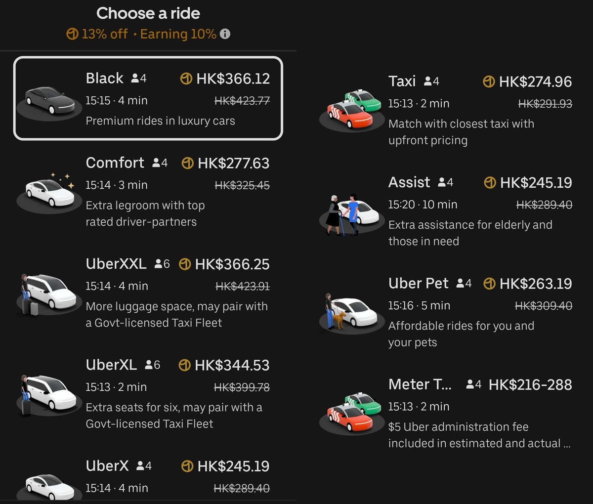Все про Uber Hong Kong. Убер в Гонконге - самый лучший способ передвижения. Ключевое - намного дешевле. чем уличные такси. Т.к. деды на старых Тойотах дерут по 50 HKD сверху за пересечение тоннеля под бухтой, даже за одну сторону. В статье я сужу на базе своего опыта, около 250 поездок на Убер за последний год. Мобильное приложение подойдет обычное Uber. Нет региональной привязки. Варианты оплаты: -наличные Гонконгские доллары. Можно вызвать обычное такси через Убер с оплатой кэшем (приедет старый дед на Тойоте). - вызов любого авто, сумма поездки спишется по безналу (AlipayHK, зарубежная банковская карта) Виды авто - обычное такси (доступна опция кэш) - Uber Comfort может приехать вообще любая рандомная машина. От Uber X тариф по-моему, абсолютно ничем не отличается. - Uber X как правило приезжает Telsa Model 3, но может приехать старая Хонда стремная грязная. - Uber XL - минивэн 6 мест. Тойота Альфард, Tesla Model X, или такси минивэн - Uber XXL - минивэн 6 мест. Но уже с гарантией 6