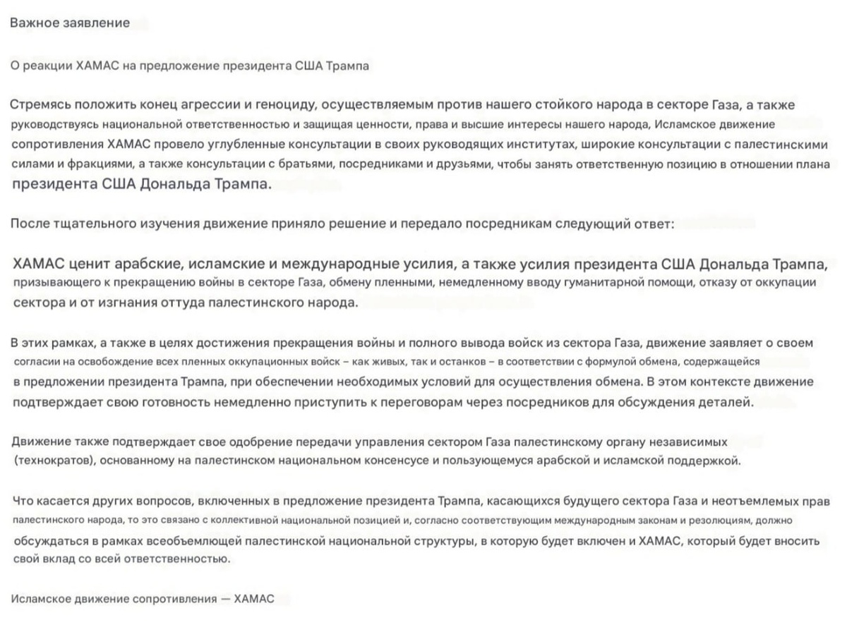 Пока мы спали, оказывается, Трамп «остановил» ещё одну войну. Только как, сообщил журналист портала Axios Барак Равид, Израиль был не в курсе, так как посчитал ответ ХАМАС фактическим отказом от американского плана по урегулированию в Газе, в связи с тем, что ХАМАС ничего не сказал про разоружение и выставил новые условия для переговоров. ЦАХАЛ даже начал новую серию бомбардировок сектора. Однако после заявления Трампа канцелярия премьер-министра Израиля опубликовала ночное заявление в Шаббат, в котором говорится, что «Израиль готов к немедленной реализации первого этапа плана Трампа по немедленному освобождению всех заложников». Начальник штаба ЦАХАЛ генерал-лейтенант Эяль Замир приказал войскам подготовиться «к реализации первого этапа плана Трампа по освобождению заложников». Приказ предписывает свести военные действия к «минимуму», а войскам на местах — строго придерживаться оборонительной тактики. Сообщается, что приказ был отдан после ночных переговоров между официальными лица
