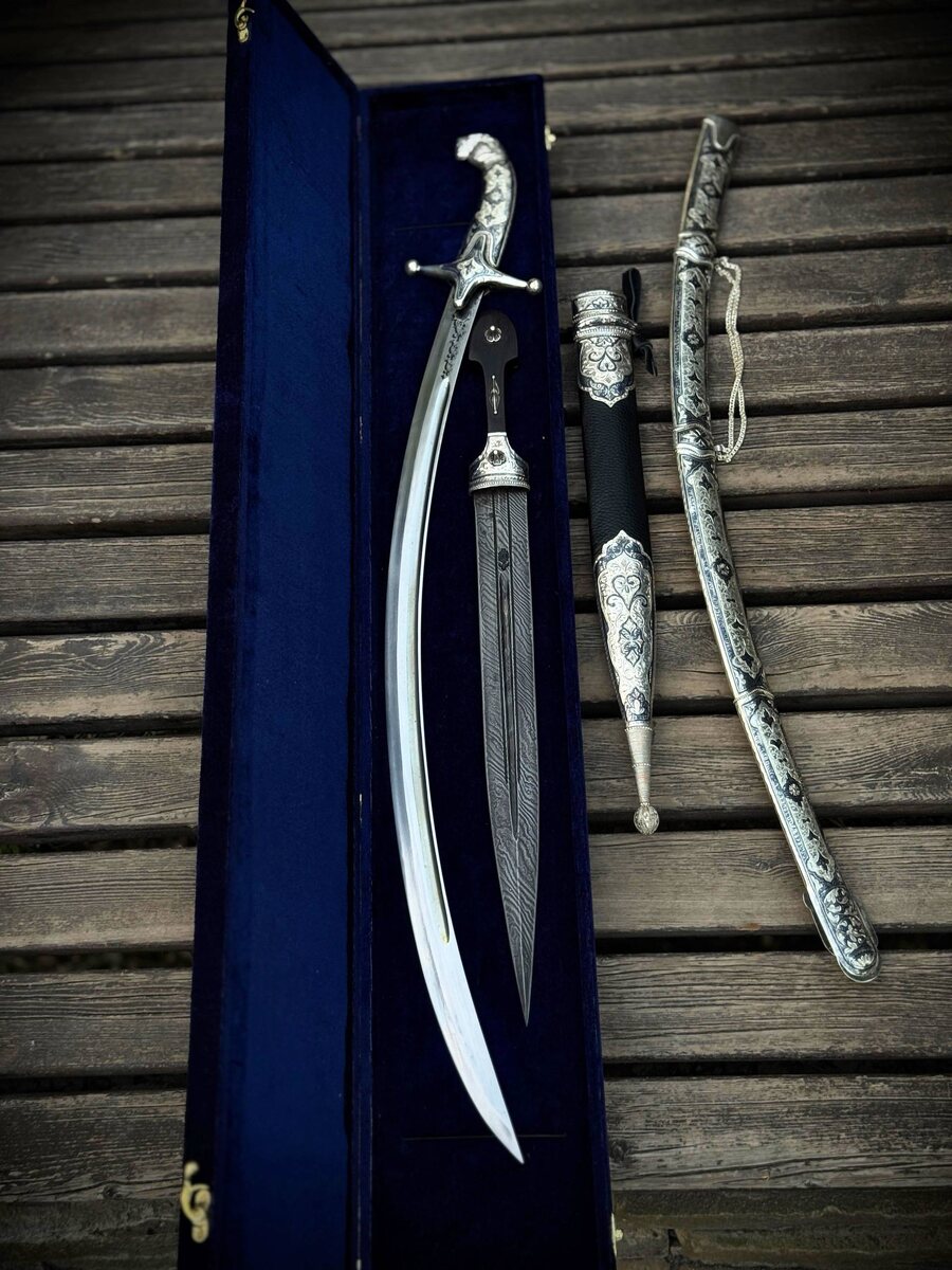 КИНЖАЛ И САБЛЯ КОМПЛЕКТ Кинжал Дамаск с авторский Сабля сталь 40х13 Гарда серебро на обеих на Кинжале, Ножны дерево обтянутой кожей Гарды на ножнах серебро 925 проба, ручная работа на ножнах так же присутствует. на Сабле полностью серебро и ручная работа 925 проба Ручная сборка футляр в подарок ⚪️цена 195.000₽ ЗАКАЗАТЬ В ВАТСАПЕ ЗАКАЗАТЬ В ТЕЛЕГРАММЕ ОТПРАВКА И ОТЗЫВЫ ⚪️+79280609590