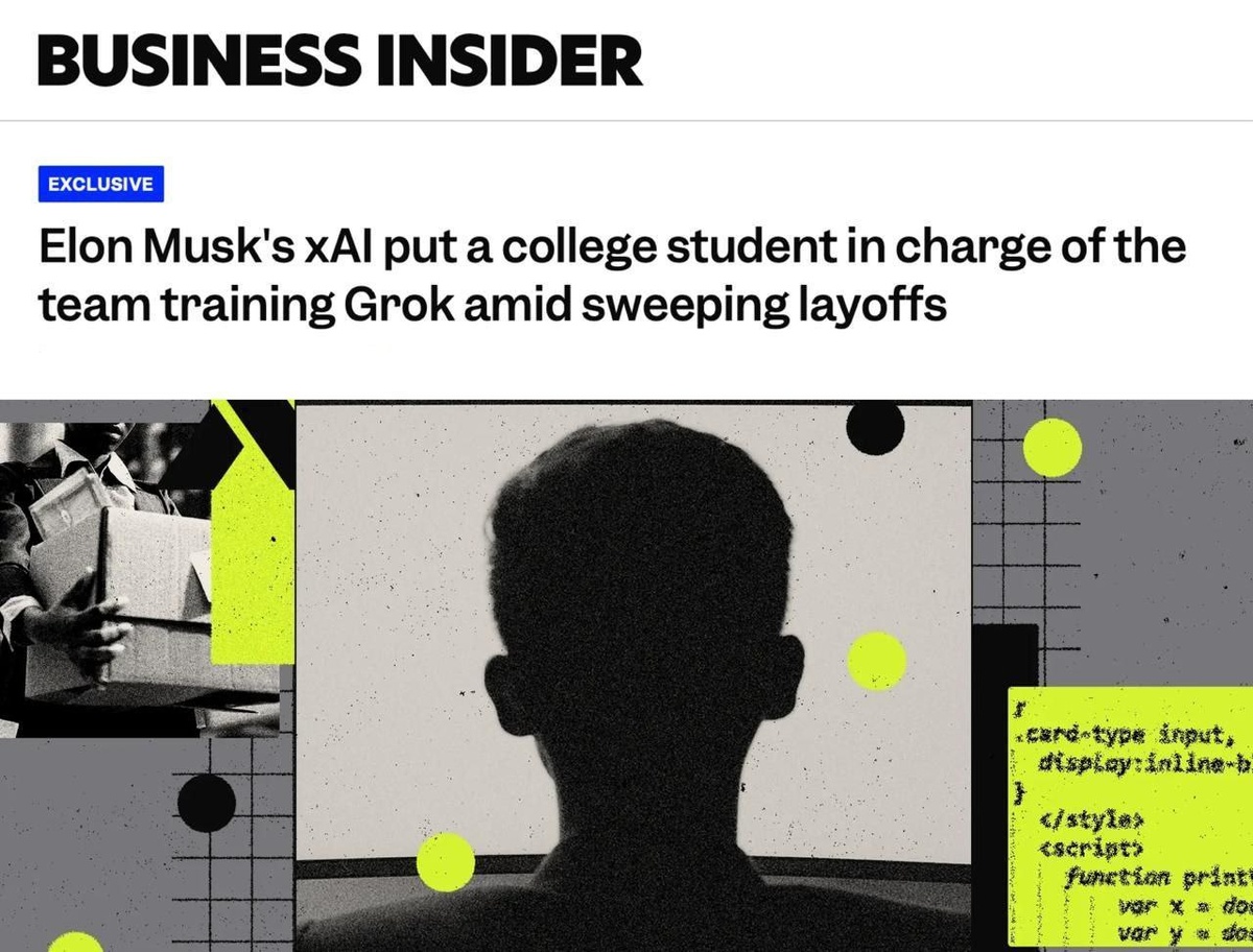 + Илон Маск назначил 20-летнего (!) парня руководить командой разметки Grok — через неделю тот уволил 600 коллег.