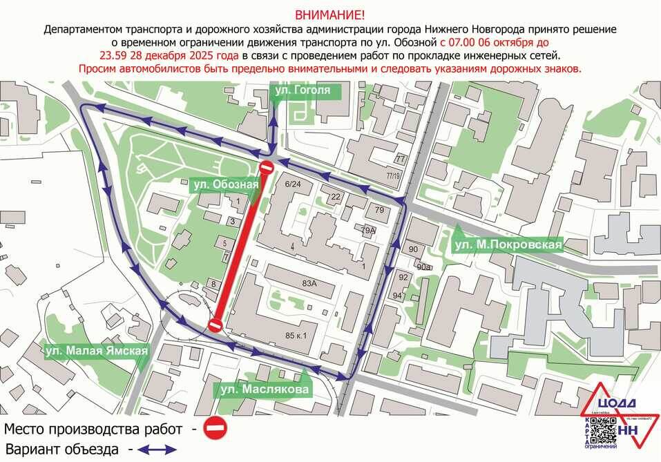 С 6 октября до 29 декабря 2025 г. в Нижнем Новгороде запретят движение транспорта по улице Обозной от улицы Малой Покровской до улицы Маслякова из-за проведения с капитального ремонта автомобильной дороги. Как сообщили в городской администрации, объезд перекрытого участка будет организован по прилегающим улицам. Специалисты профильного департамента мэрии рекомендовали автомобилистам быть предельно внимательными и следовать указаниям дорожных знаков. Также стало известно, что с 5 октября 2025 г. и до окончания работ по переустройству инженерных сетей будет ограничено движение транспорта на улице Большой Печерской — участке от улицы Сеченова до улицы Ковровской. Ранее NN.DK.RU писал, что в Нижнем Новгороде сняли ограничения для движения транспорта на участке улицы Ошарской от улицы Белинского до улицы Невзоровых.