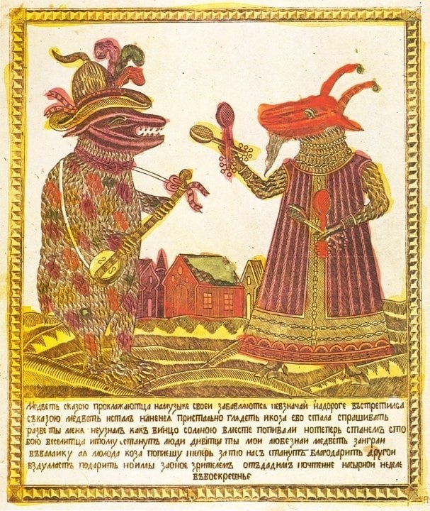 Коза и медведь с балалайкой. Лубок, XVIII в.